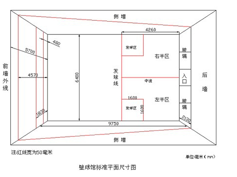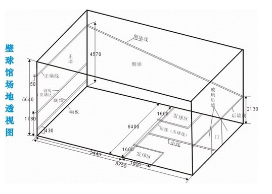 寬6.4米,長9.75米,前高4.57米,后高2.13米,天花高度5~6米,響板高度0.48米,正面發球線高度1.83米,地面發球線距后墻4.26米,半場線將地面發球">